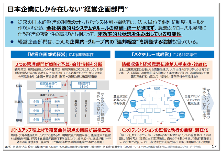 前回に続き、経済産業省製造産業局が2024年5月に公表した資料「製造業を巡る現状と課について今後の政策の方向性」からスライド17ページ「日本企業にしか存在しない“経営企画部門”」について、背景・構造・課題・国際比較の視点から解説をします。