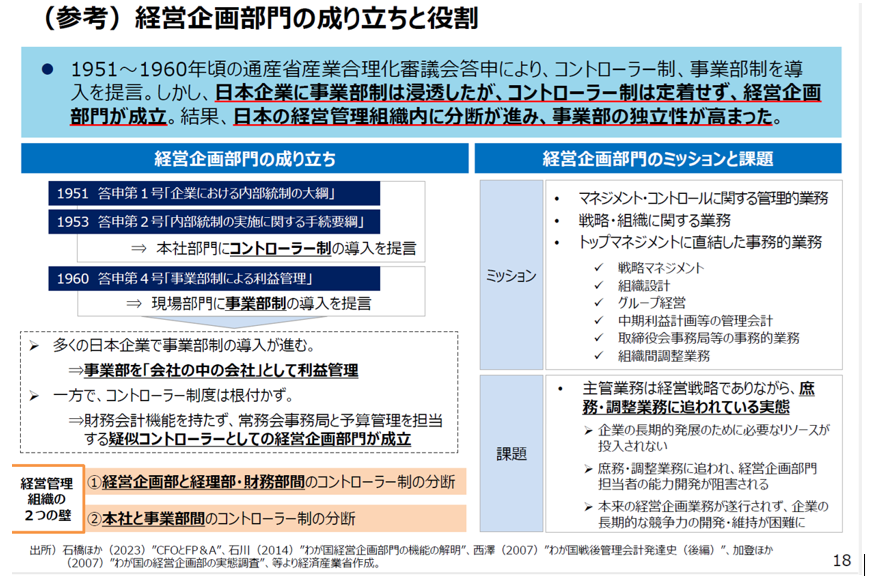 「(参考)経営企画部門の成り立ちと役割」について、歴史的経緯から成り立ち、制度背景、構造的矛盾、今日の課題、改革の方向性に至るまでを多面的に解説いたします。