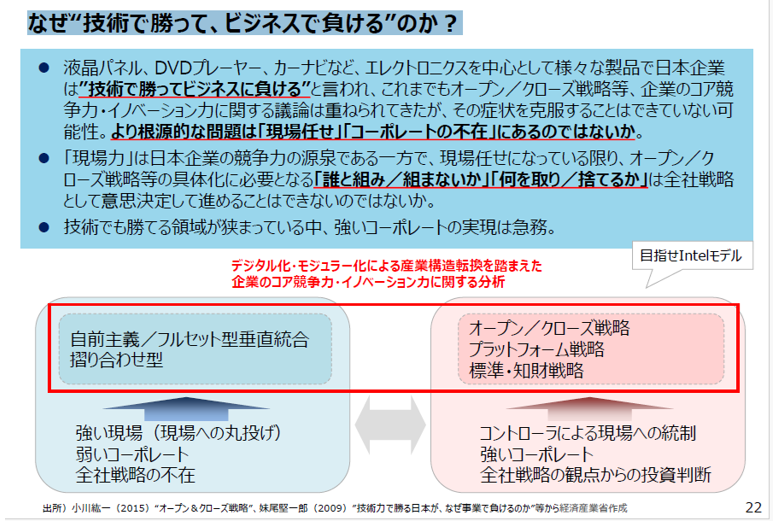 この資料では、その原因を「オープン/クローズ戦略の未整備」「イノベーションモデルの欠如」といった表層的な議論にとどまらず、より本質的な要因である「現場任せ」と「コーポレート機能の弱さ」、さらには「全社戦略の不在」にあると指摘しています。