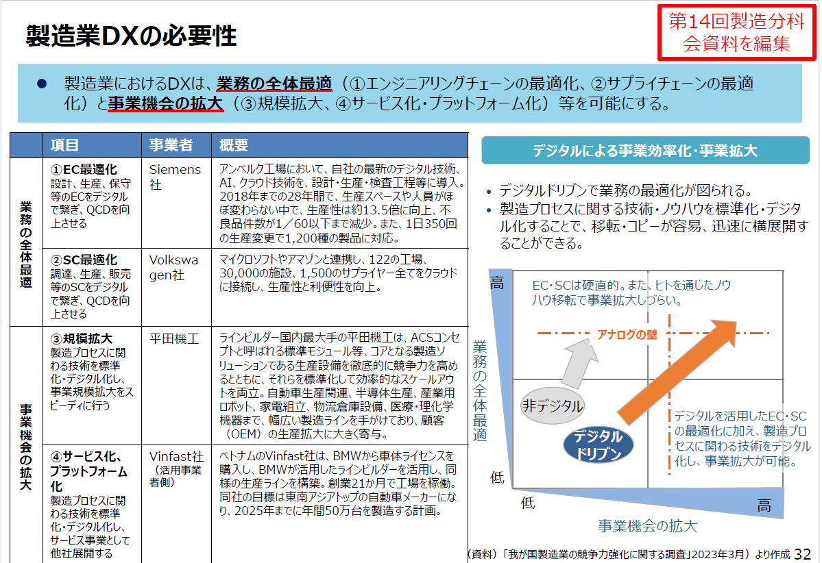経済産業省製造産業局が2024年5月に公表した資料「製造業を巡る現状と課題について今後の政策の方向性」からスライド32ページ「製造業DXの必要性」について解説をします。