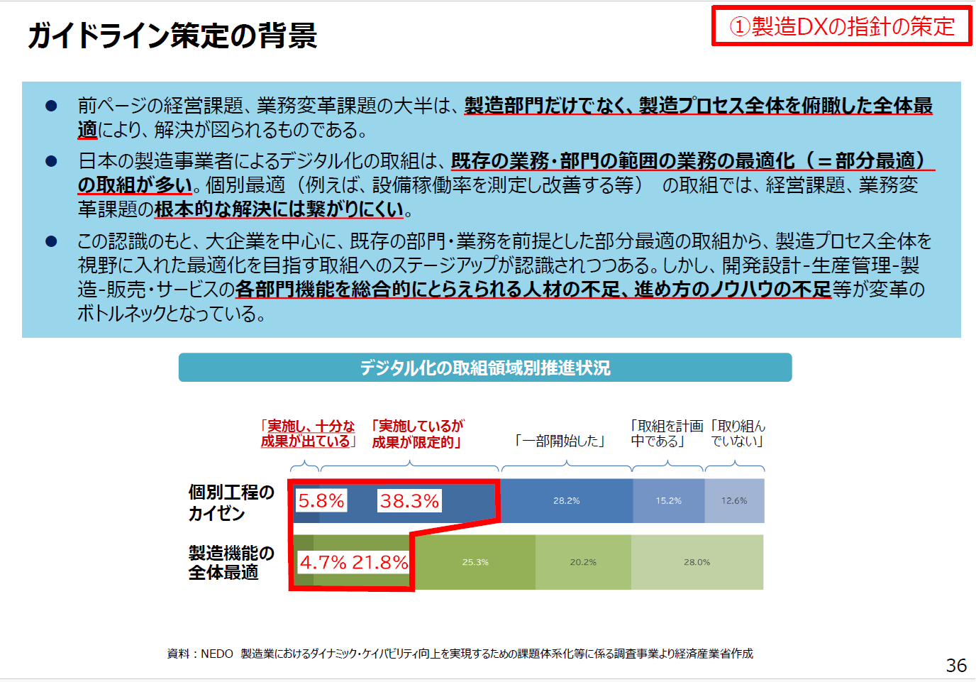 このスライドは、製造業DXのガイドラインを策定する背景となる現状認識を示しています。冒頭の3つの箇条書きが、その問題意識を端的に表しています。
